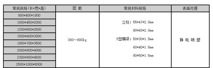 层板货架的结构特点:通常也称作层板式货架由立柱片、横梁和层板组成 产品特点:适用于人工存取货物情况,层板为宽度方向铺设,货架承载能力大.广泛应用于各个行业, 具有成本低、安全可靠、组装、拆卸简单的特点、可单独使用,也可自由拼接成各种排列方式,层高可按50mm节距自由调节。货架的每层的承载重量在300-800KG。